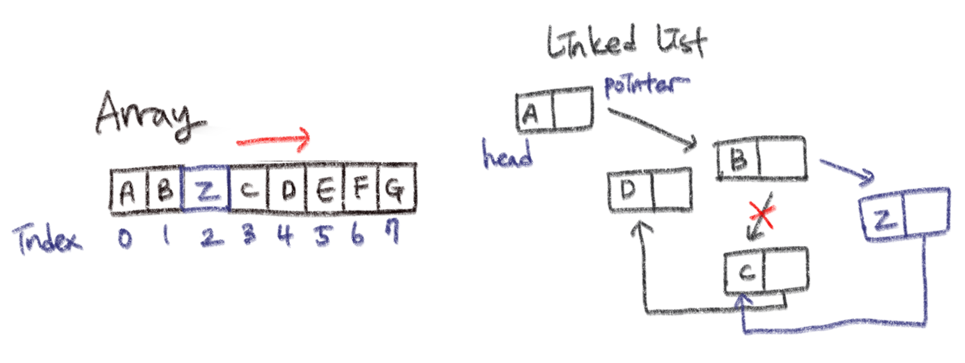 - Linked List는 B의 pointer 값을 수정하고, Z에 새로운 pointer 값을 넣기만 하면 된다. 뒤에 아무리 많은 요소가 있더라도 동일하다.