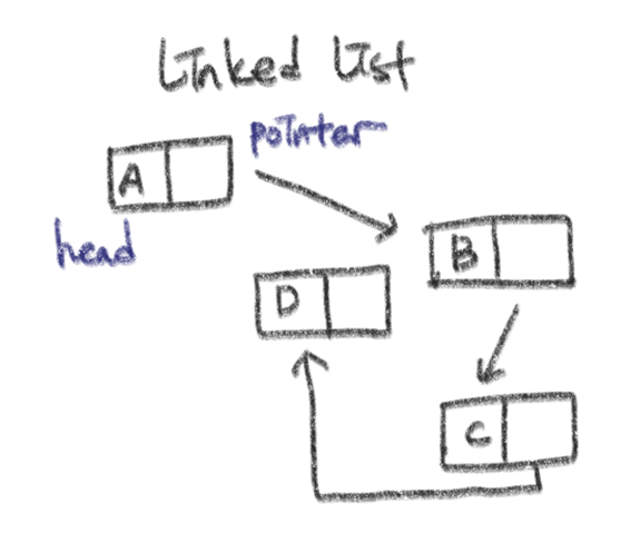 - 그런 이유로, Linked List는 실제 정보(head, A)뿐만 아니라 주소값(pointer)이라는 정보를 하나 더 들고 있어야 한다.